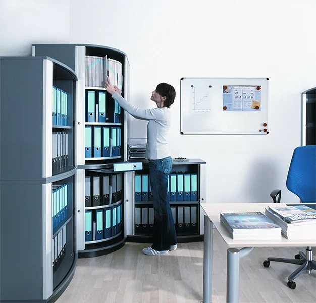 L'armoire Corner est spécialement conçue pour exploiter les angles morts de vos pièces, souvent inutilisables avec du mobilier standard. Grâce à son mécanisme rotatif fluide, elle offre une capacité de classement exceptionnelle tout en restant discrète. C'est l'outil indispensable pour les espaces restreints qui exigent une organisation rigoureuse et un accès rapide aux archives de proximité.